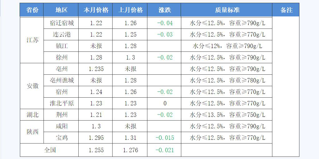 3月1日-3月31日,國內小麥價(jià)格滯漲回落。各地小麥價(jià)格月度變化情況如下: