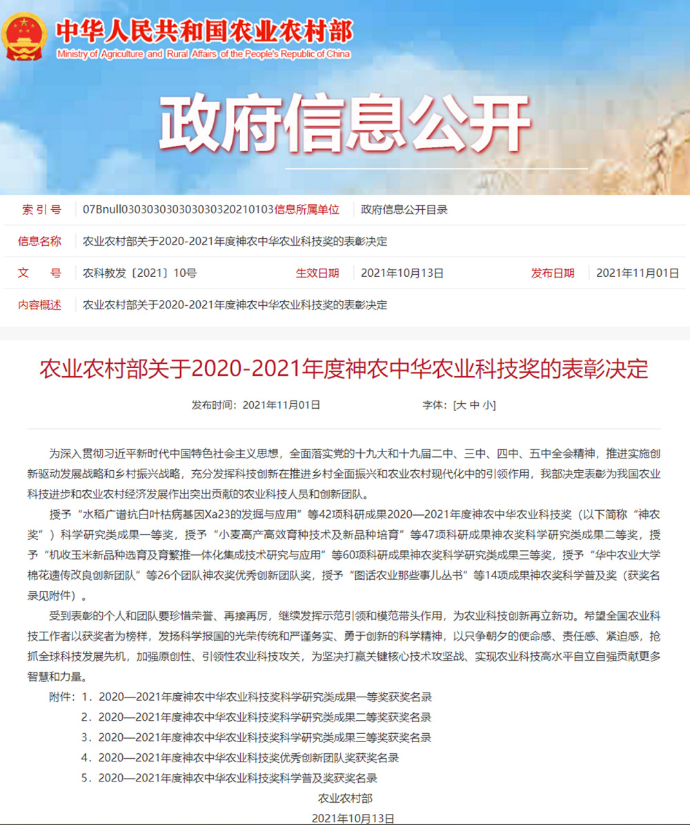 “神農中華農業(yè)科技獎”是2006年1月經(jīng)農業(yè)部、科技部批準設立的面向全國農業(yè)行業(yè)的綜合性科學(xué)技術(shù)獎,是原農業(yè)部科技進(jìn)步獎的繼承和延伸,其獲獎成果代表農業(yè)行業(yè)的科技發(fā)展水平。此次獲獎,標志著(zhù)公司現代農業(yè)技術(shù)研發(fā)水平再上新臺階,為公司打造開(kāi)放式研發(fā)平臺、構建全產(chǎn)業(yè)鏈一體化現代農業(yè)科技創(chuàng )新體系注入發(fā)展新動(dòng)能。