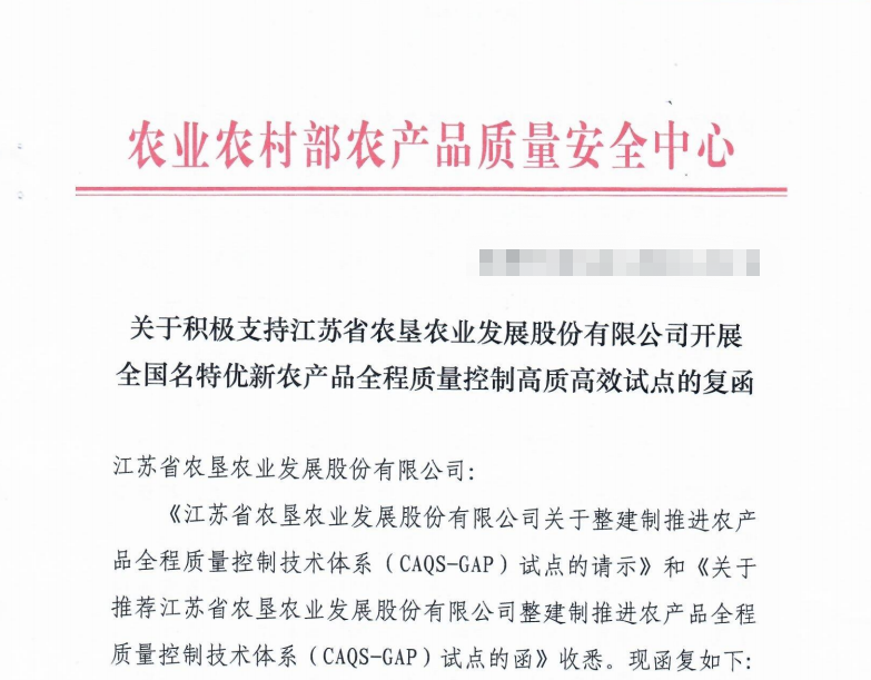近日,農業(yè)農村部農產(chǎn)品質(zhì)量安全中心正式復函批復江蘇省農墾農業(yè)發(fā)展股份有限公司(簡(jiǎn)稱(chēng):蘇墾農發(fā))積極支持開(kāi)展全國名特優(yōu)新農產(chǎn)品全程質(zhì)量控制高質(zhì)高效試點(diǎn)。蘇墾農發(fā)成為全國第二家、江蘇省第一家整建制獲批推進(jìn)農產(chǎn)品全程質(zhì)量控制技術(shù)體系(CAQS-GAP)試點(diǎn)單位的企業(yè)。