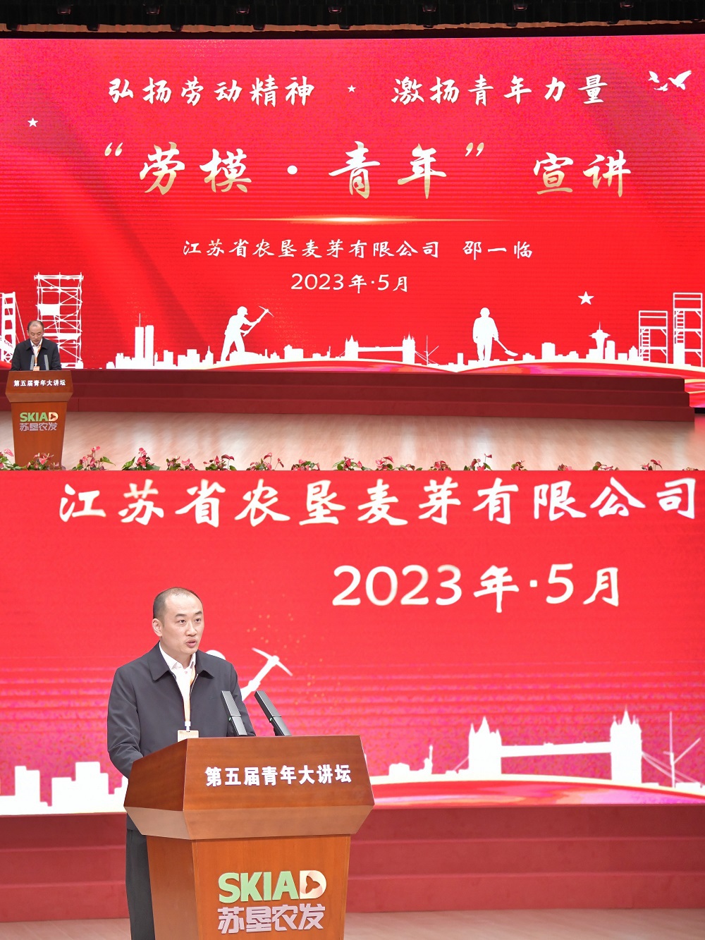 •        五月春意盎然,青年風(fēng)華正茂。為深入學(xué)習貫徹習近平新時(shí)代中國特色社會(huì )主義思想和黨的二十大精神,充分展現新時(shí)代蘇墾農發(fā)青年朝氣蓬勃、奮發(fā)有為的青春活力,5月4日,由蘇墾農發(fā)工會(huì )主辦、蘇墾農發(fā)淮海分公司工會(huì )承辦的蘇墾農發(fā)第五屆青年大講壇活動(dòng)在淮海農場(chǎng)大禮堂圓滿(mǎn)落下帷幕。蘇墾農發(fā)公司黨委副書(shū)記、工會(huì )主席王進(jìn)強出席活動(dòng)并致開(kāi)幕辭,淮海農場(chǎng)公司黨委書(shū)記、董事長(cháng)、蘇墾農發(fā)淮海分公司總經(jīng)理王燦明主持開(kāi)幕式,來(lái)自蘇墾農發(fā)總部和各分、子公司共27個(gè)代表隊參加活動(dòng)。