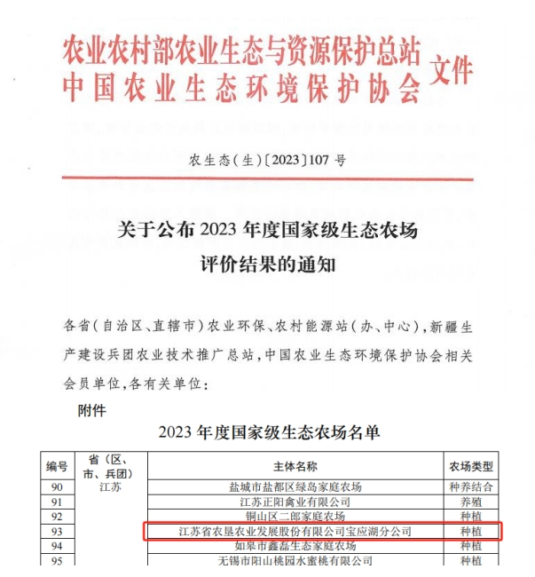 •        近日,農業(yè)農村部農業(yè)生態(tài)與資源保護總站、中國農業(yè)生態(tài)環(huán)境保護協(xié)會(huì )公布了2023年度國家級生態(tài)農場(chǎng)評價(jià)結果,江蘇省農墾農業(yè)發(fā)展股份有限公司寶應湖分公司成功入選,是江蘇省25家單位中唯一一家協(xié)會(huì )理事推薦單位。