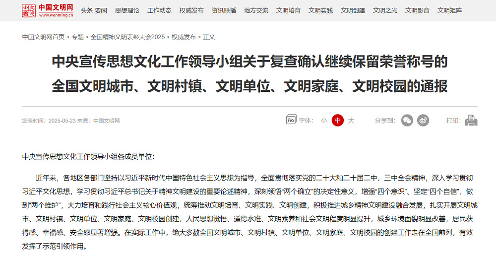 5月23日,中央宣傳思想文化工作領(lǐng)導小組公布《關(guān)于認定命名第七屆全國文明城市、文明村鎮、文明單位和第三屆全國文明家庭、文明校園的決定》和《關(guān)于復查確認繼續保留榮譽(yù)稱(chēng)號的全國文明城市、文明村鎮、文明單位、文明家庭、文明校園的通報》。蘇墾農發(fā)順利通過(guò)復查評估,繼續保留“全國文明單位”稱(chēng)號,這是繼2020年首創(chuàng )首成第六屆“全國文明單位”后又一次獲此殊榮。